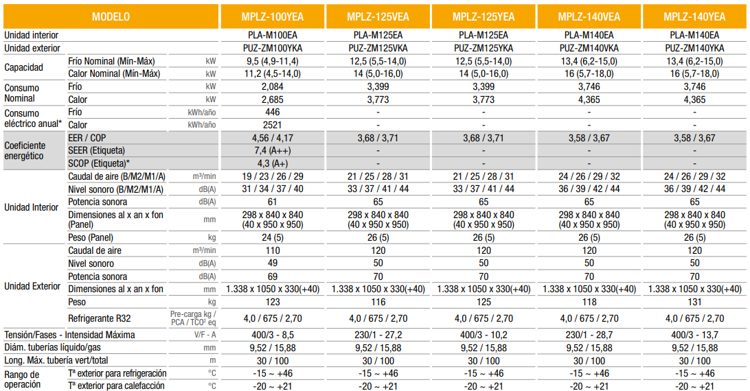 Aire Acondicionado Mitsubishi Electric Cassette MPLZ 140 YEA, Capacidad frigorífica: 11.524 Kcal/h (13.40 kW). Capacidad calorífica: 13.760 Kcal/h (16.00 kW). Refrigerante: R-32.-