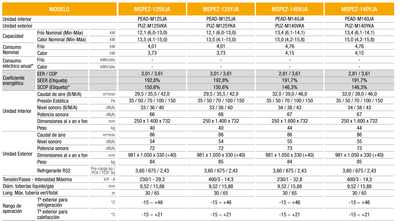 Las características del aire acondicionado MSPEZ-125VJA
